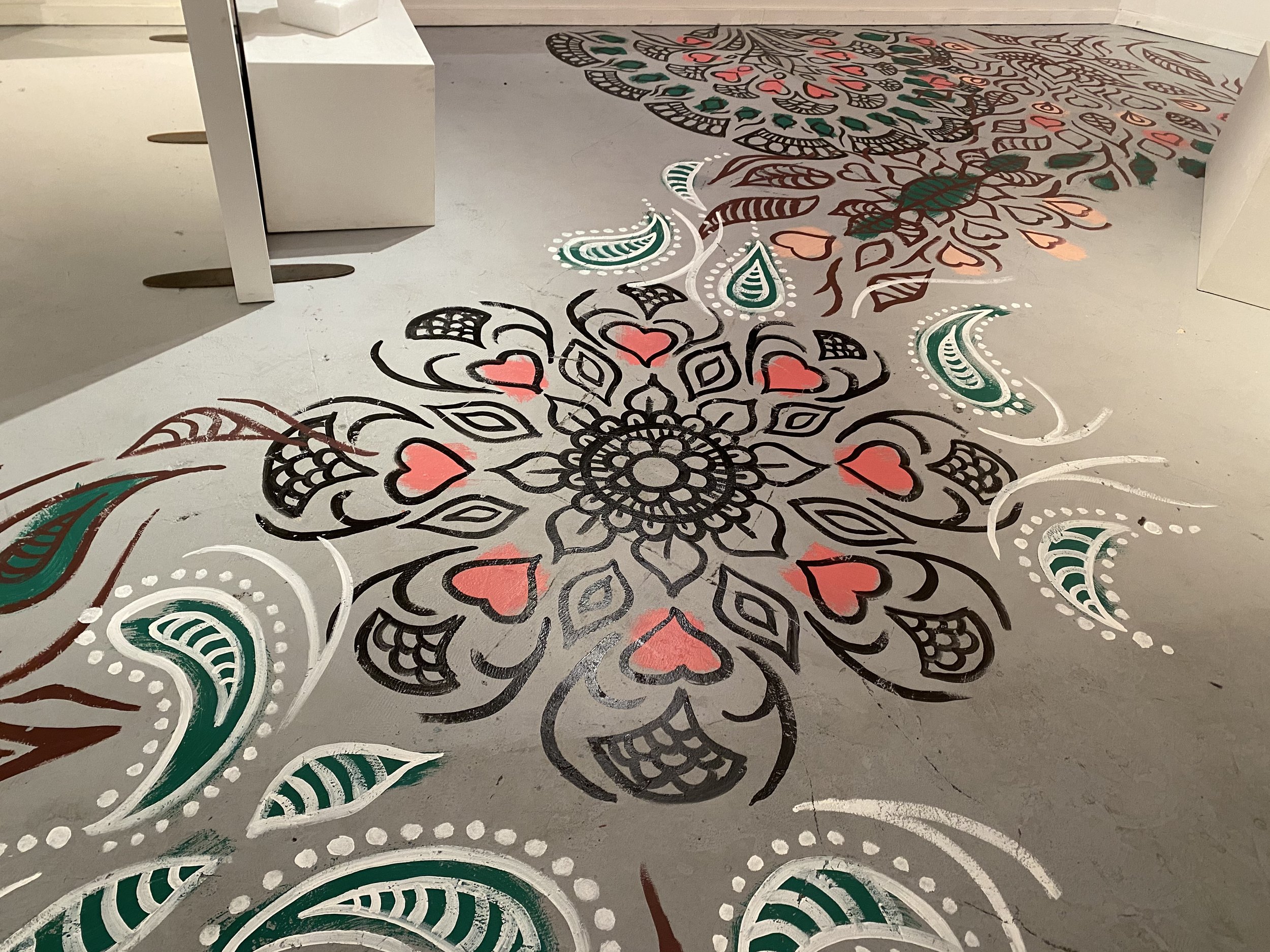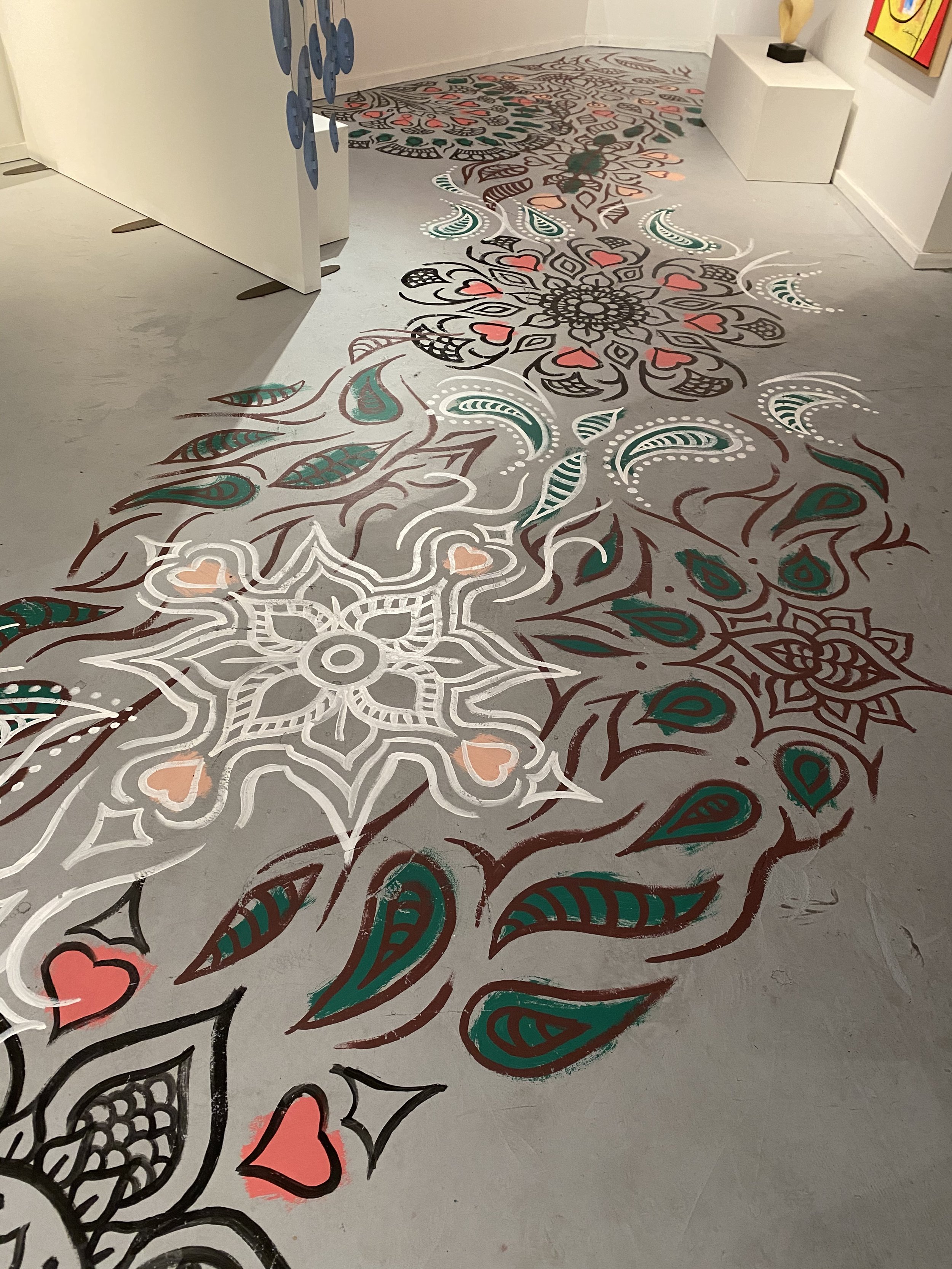 This was a quick commission by Five 3 Gallery based in Laguna Beach. The curator wanted an entrance for a special Valentines Day show. The idea was to have an entrance that was romantic themed. Using the vegetable based paints provided, I improvised layered designs that incorporated hearts, flowers and interesting patterns.